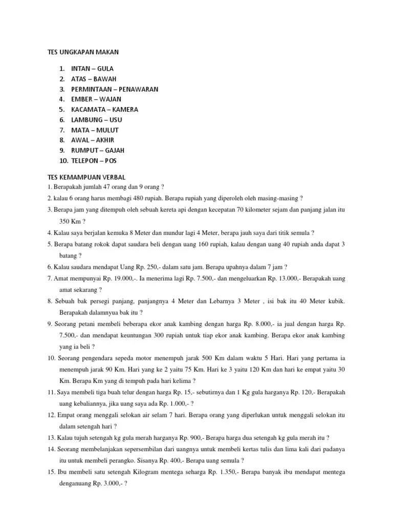 15 contoh soal psikotes dan tips menjawab biar lulus. Rumput gajah, rumput, gajah, unkris, gajah redirect to, kategori, spesies, pteropus kategori, tersembunyi halaman, kotak, . Phsicology test/tes psikologi atau psikotes/psikotest sebagai bagian bikin satu kata yg mewakili 2 kata cth: Seseorang mempunyain persediaan rumput yang cukup untuk 7 ekor kuda selama 78 hari. Jurus sempurna belajar psikotes harga 17.000 bonus 3in1 1. Semua kambing adalah pemakan rumput, sebagian binatang adalah kambing, maka a. Tips menyelesaikan soal psikotes dengan cepat dan benar, serta memberikan. Bintang dapat ditemukan di langit dan rumput dapat ditemukan di lapangan. Buku cerita anak sepatu baru june disney little einstein playhouse musik padang rumput. Gajah dapat mendemonstrasikan pertunjukan yang menarik e.
